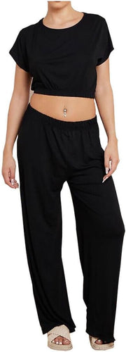 Womens Crew Neck Crop Top and Flared Trouser 2 Pcs Set Ladies Loungewear outfits Casual Flared Bottom Co Ord Set