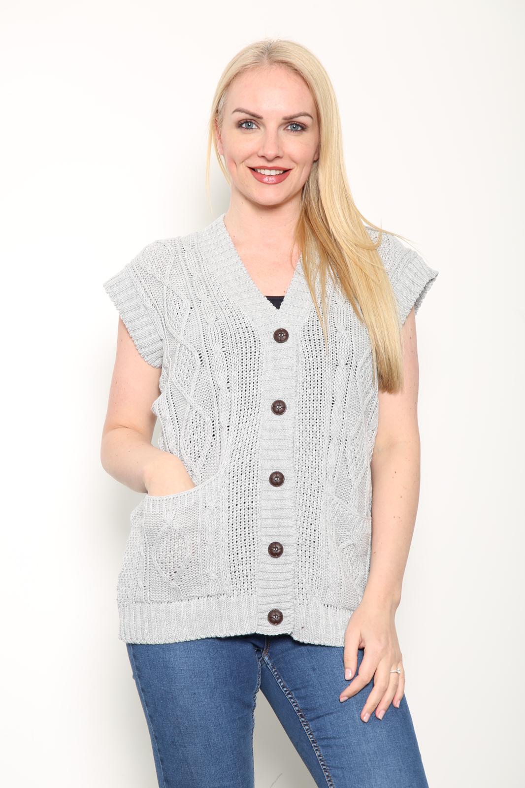LADIES SLEEVELESS 5 BUTTON WAISTCOAT KNITTED 2 POCKETS V/NECK SELF COLOUR KNITWEAR FRONT PATTERN W/COAT ALL YEAR ROUND WEAR